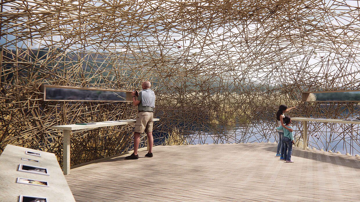 Appearing to float above a tea field, this teahouse becomes part of a new landscape system by 'vanishing' twice. The first 'vanishing' involves 170 steel poles scattered across the field, creating a forest-like installation that conceals the teahouse. The second has misting devices fitted to 100 poles, generating an enigmatic drifting fog that envelops the teahouse, inviting a contemplative experience.