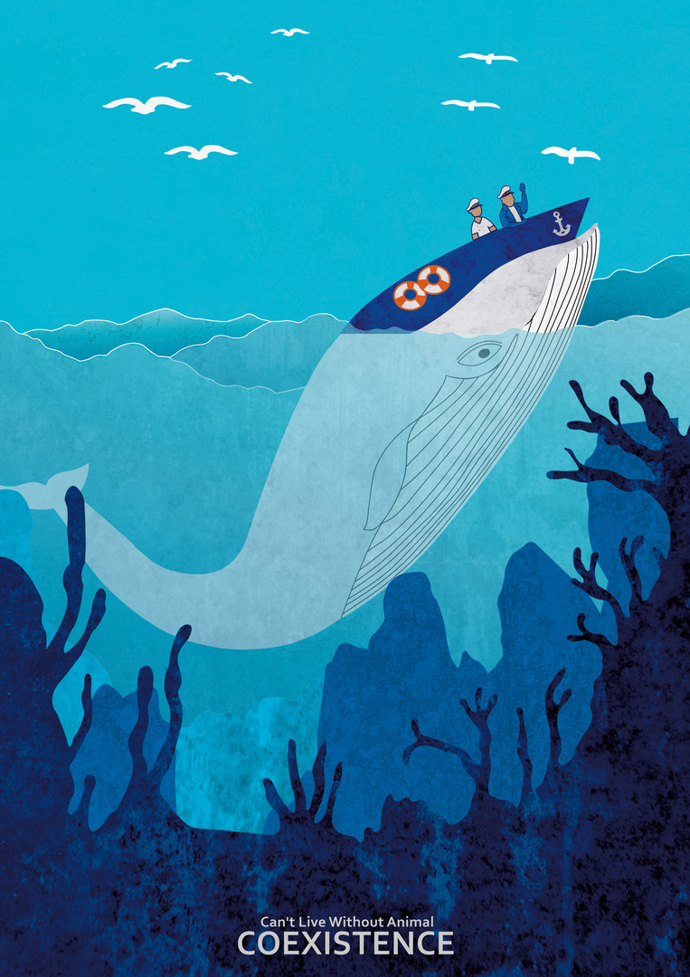 These highly expressive posters are an appeal for friendly coexistence and social relationships between humans and animals. Animals are part of the world in which each species eventually influences the balance of the entire food chain. They are of pivotal significance even for people living in cities. The posters also demonstrate that animals are deeply rooted in their environment. These ideas have been implemented through motifs of animals, such as a whale or a giraffe, adapting to the human environment and even merging with it in terms of colour.