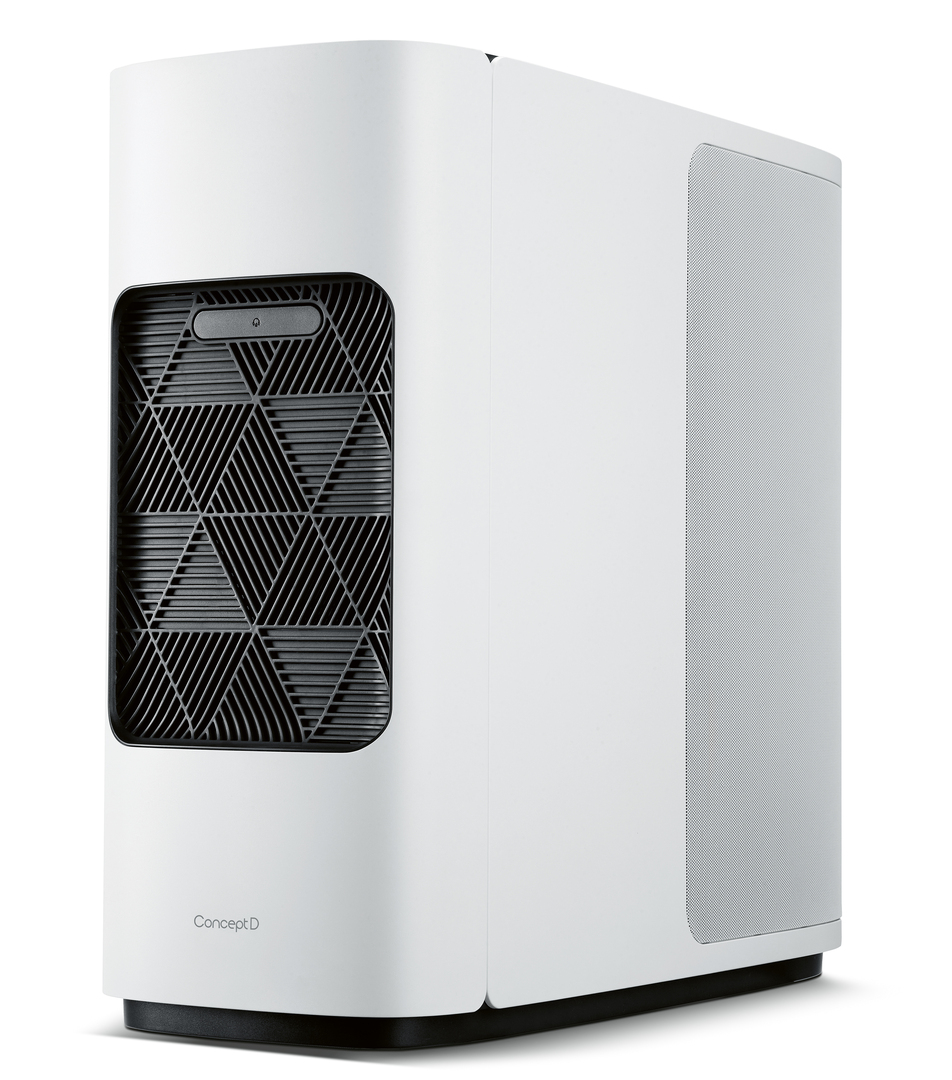 ConceptD 700 was designed for creative workers who need a quiet PC with powerful graphics for complex 3D applications. In order to accomplish this task, the computer is equipped with several fans that suck in air through the large grille at the front and circulate it inside the chassis. The design, with its smoothly rounded edges and dark top featuring a wood pattern, makes the computer look like a Scandinavian piece of furniture and lends it a natural appearance.