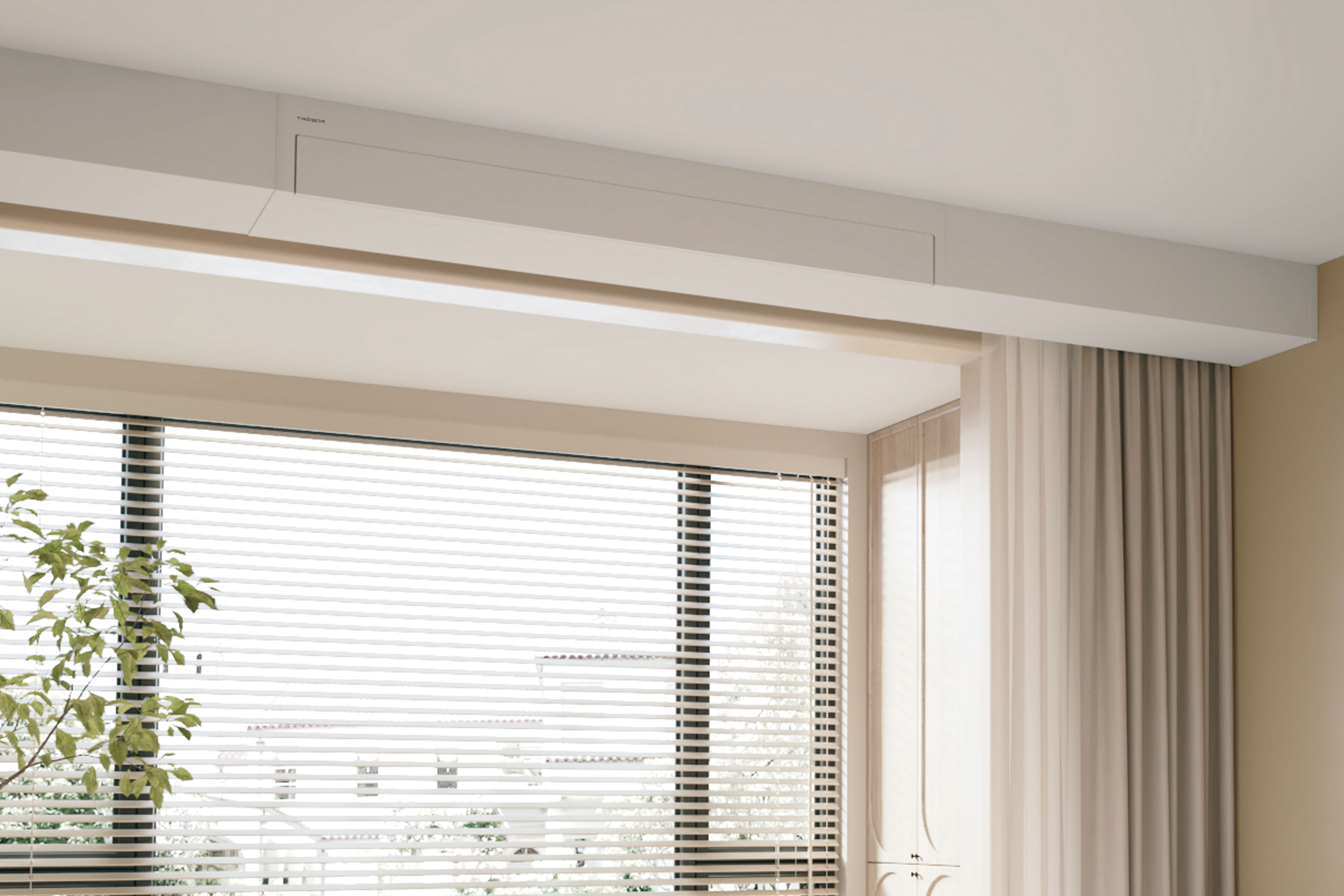This innovative air conditioner features a central cooling unit flanked by two side panels made of extruded plastic, creating a cohesive design that harmonises with the room’s decor.