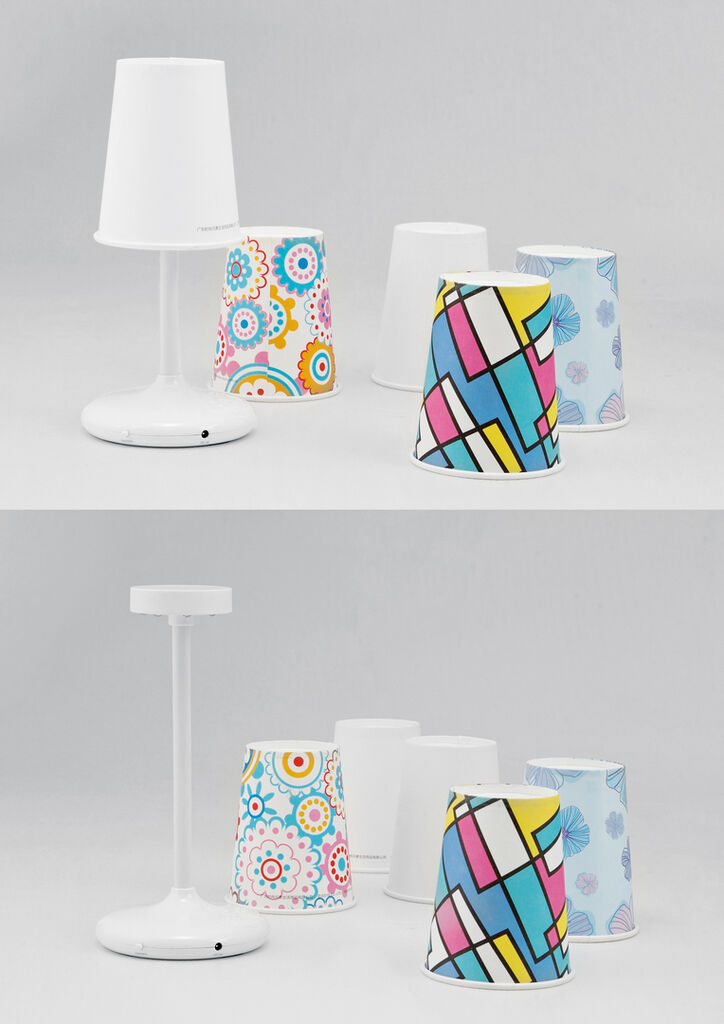 Paper, glass or plastic cups serve as lampshades on the piano lacquer lamp stand of the Cup concept. Since the shades are different in style, pattern and colour, each creates a highly individual light quality. Thanks to the LEDs, the lamp consumes little energy yet promises a long lifespan. Cup concept comes with a charger and power supply unit, so that the lamp is always ready to use.