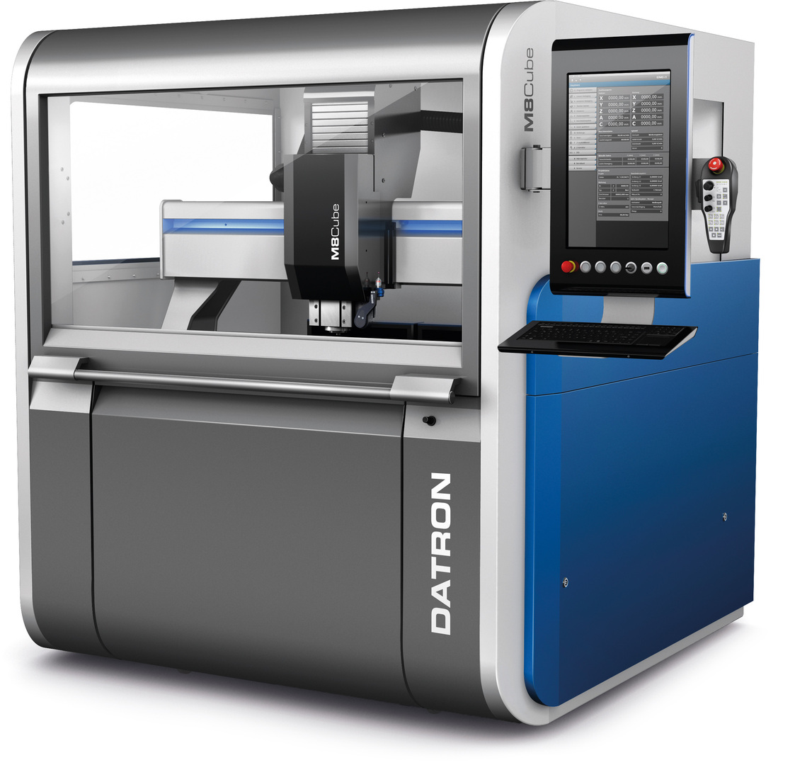 The Datron M8Cube is a high-performance CNC milling machine. Its minimalist form and contrasting colour scheme deliberately direct attention to the operational process, that is, to the milling area. Machine activity is clearly visible through three large viewing windows. A slim user terminal with an integrated touchpad enables the user to easily execute the milling programmes. The integration of clearly positioned signal lights in the user terminal and on the machine cabinet provides clear information about the machine’s operational status. A space-saving flap concept and the large chip drawer integrated into the machine’s housing ensure ergonomic and fatigue-free working conditions.