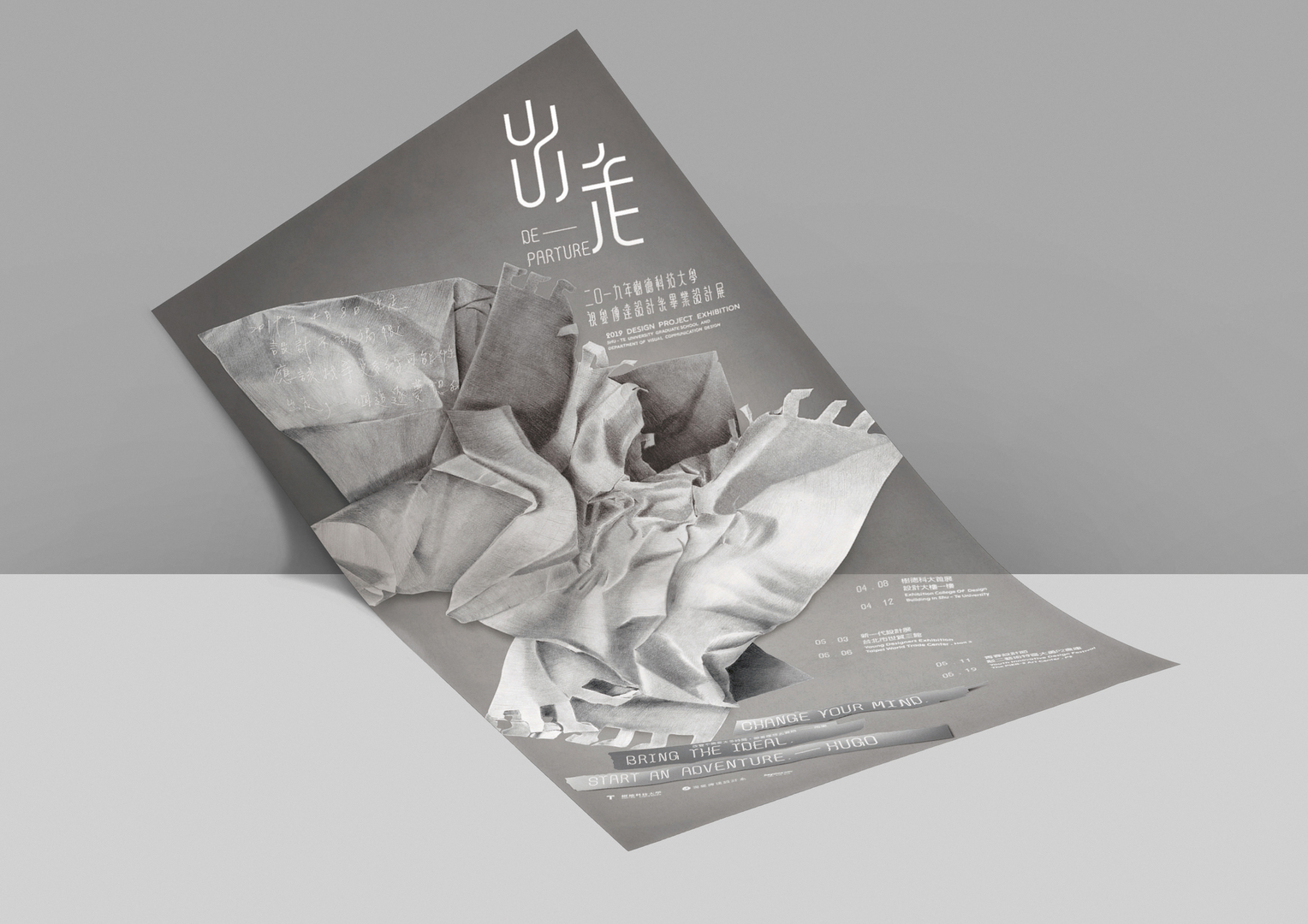 This work announces a graduation exhibition of design students in Kaohsiung. On the poster, a piece of sketch paper, torn off and discarded in the air, symbolises the end of student days. A distinctive feature which makes the motif stand out is its fine graphic nuances. They are the result of an elaborate printing process using two-tone printing and silver screen printing on the front, and white screen printing on the back. By showing the joy of experimentation, the poster also refers to the birth of ideas and the vigour of creative work in general.