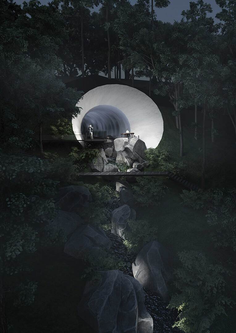 In Chinese tradition and culture, the moon represents ‘the lofty character of the literati spirit and the yearning emotion in the secular life’. Inspired by the moon’s symbolism, the design team locates the precise position and orientation of the tunnel above the valley to slice the tunnel and the entrance to the tunnel in a manner that simulates the earth-moon projection relationship. This creates a crescent facade on the tunnel entrance in the mountain, demonstrating the relationship between spirit and life from an aesthetic and philosophical perspective.