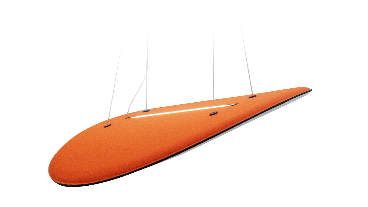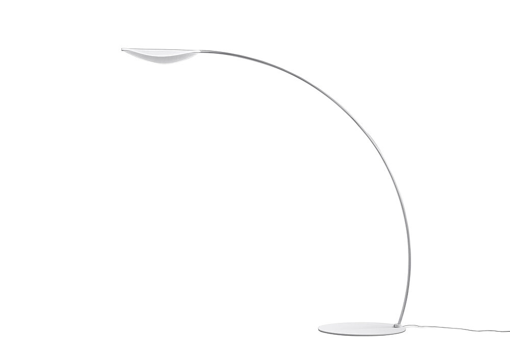 The LED light source of Diphy is housed in a slim white aluminium bar which fills a screen-printed diffuser, made of acrylic glass, with light. Its transparency creates a harmonious contrast to the brightness the lamp provides when it is switched on. In the pendant version, the light bodies resemble leaves moving in the wind, while in the standard lamp, a single large leaf-shaped diffuser suffices to illuminate the space below.