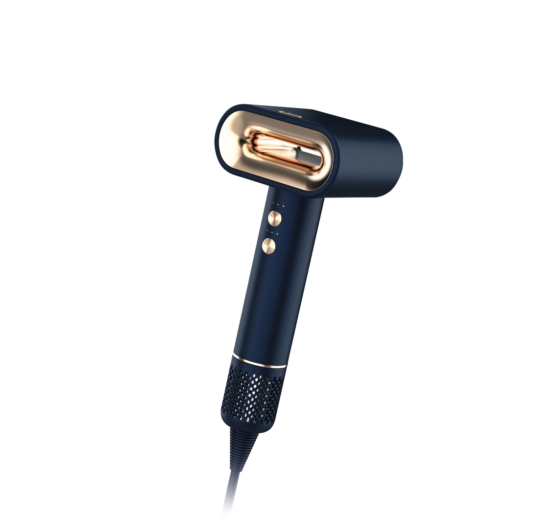 The DJM Hairdryer manages without the conventional blade structure inside. The patented motor creates a strong airflow during drying and is notably quiet in operation. Thanks to the integrated thermostat and ionic function, the compact device provides for gentle hair styling. The rounded appearance is defined by clean contours. A distinctive detail is the copper-coloured, glossy nozzle which contrasts effectively with the matt black body.