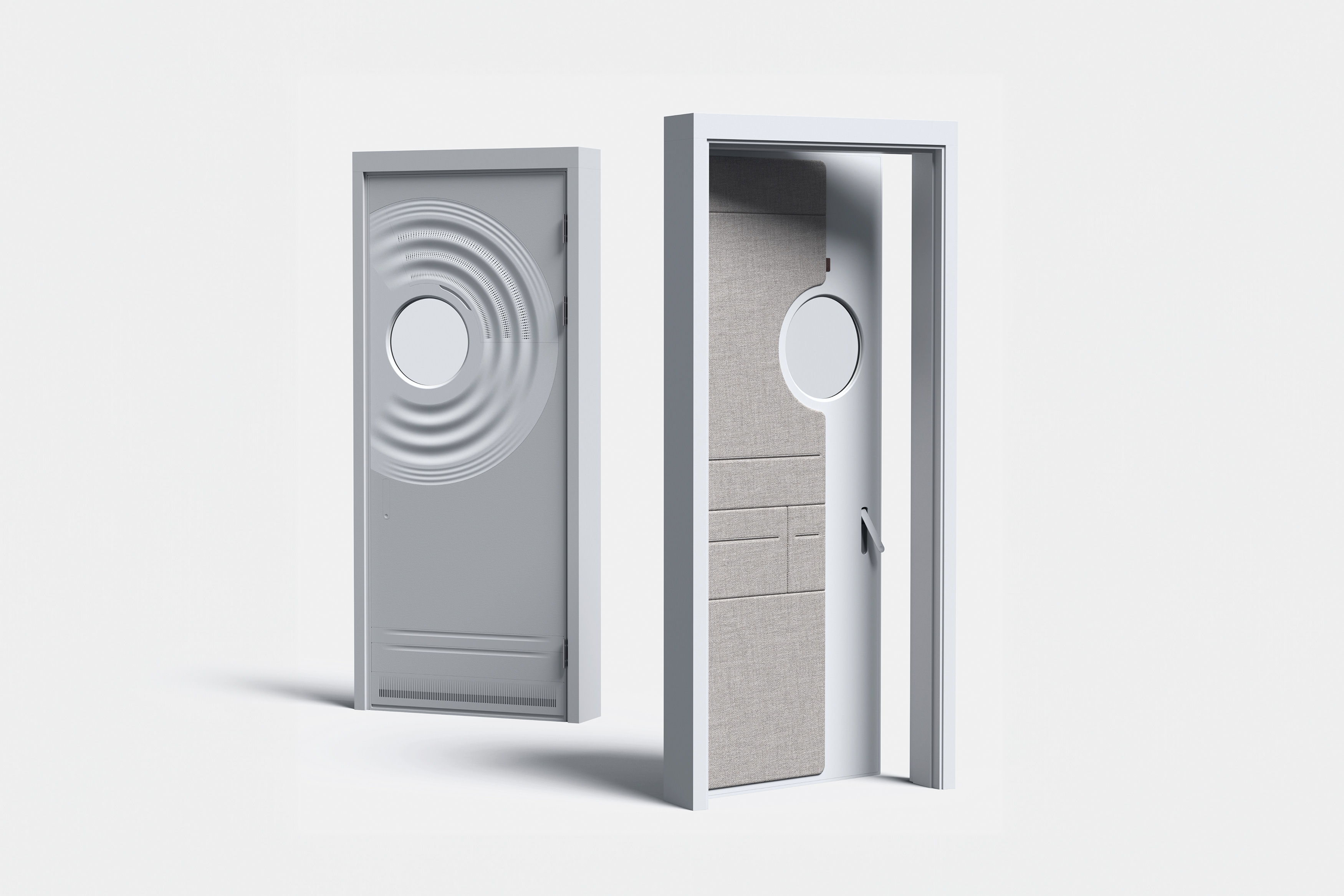 Dooair, a smart air purification door, enhances share house living by combining a door with an air purifier, ensuring privacy and air circulation. Air is drawn from the bottom, purified, and expelled from the top. The push-to-open filter and fan are detachable for easy cleaning. A window display enables transparency adjustment, and fabric pockets outside the door minimise mail loss. Red Dot Award: Design Concept | Red Dot: Next Gen Award | Concept | Household Appliances and Accessories