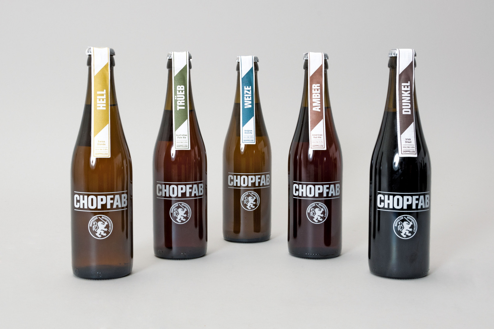 Doppelleu Brauwerkstatt is a young brewery in Winterthur (CH). On the basis of the defined corporate strategy, a dual brand strategy was developed. The premium brand “Doppelleu” symbolises Winterthur’s coat of arms, showing its emblem the lion, integrated with the two basic ingredients of beer: hops and malt. The high-volume brand “Chopfab” refers to the city’s patron Saint Alban who was executed by beheading. The black colouring of the brand identity reflects the promise of the beer: high quality, innovative, upmarket.