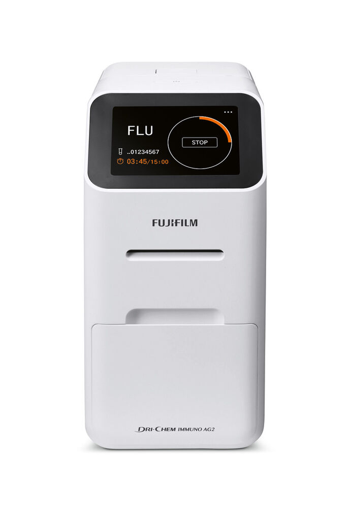 The clinical chemical analyser Dri-Chem Immuno AG2 enables a highly precise identification of viruses by applying silver amplification technology, as used in developing photographs. The vertically oriented housing has a very small footprint, so that several devices can be installed next to each other in a space-saving way. Moreover, its reduced surface area makes it easy to clean. The user can visually identify the work status based on the colour illumination of the LCD display, even from a distance.