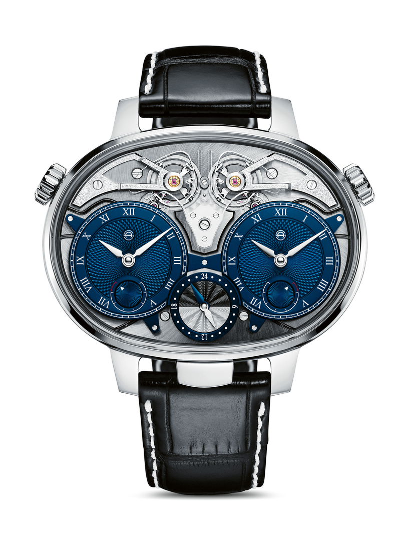 The oval shaped case is the logical consequence of the two side-by-side instead of vertical configurations of the movements. The additional space allows for two spring housings per movement and a longer power reserve. Thus, the glass back enables a view of the four spring housings simultaneously winding up. The independent movements make it possible for the Dual Time Resonance to display two time zones or a timer or countdown setting. Furthermore, a power reserve indicator and a 24-hour indicator are located at six o’clock on the hand-guilloche dials.