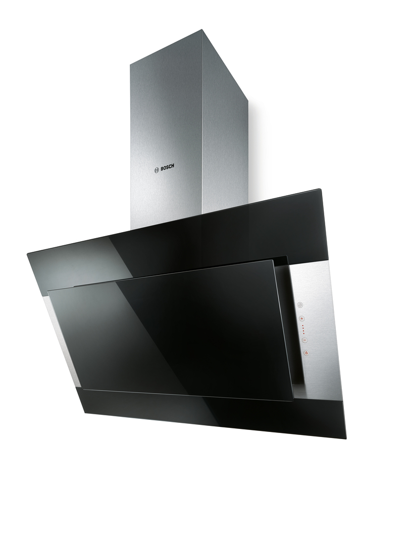 The wall-mounted chimney hood series gets its aesthetic character through the interaction of form, colour and material. To realise a decent design language, an almost gap-free surface was developed. The hood with its 90 cm wide glass or stainless steel screen is inclined upwards and allows full headroom during the cooking process. Behind the coloured glass surface, a dishwasher-safe stainless steel filter is concealed.