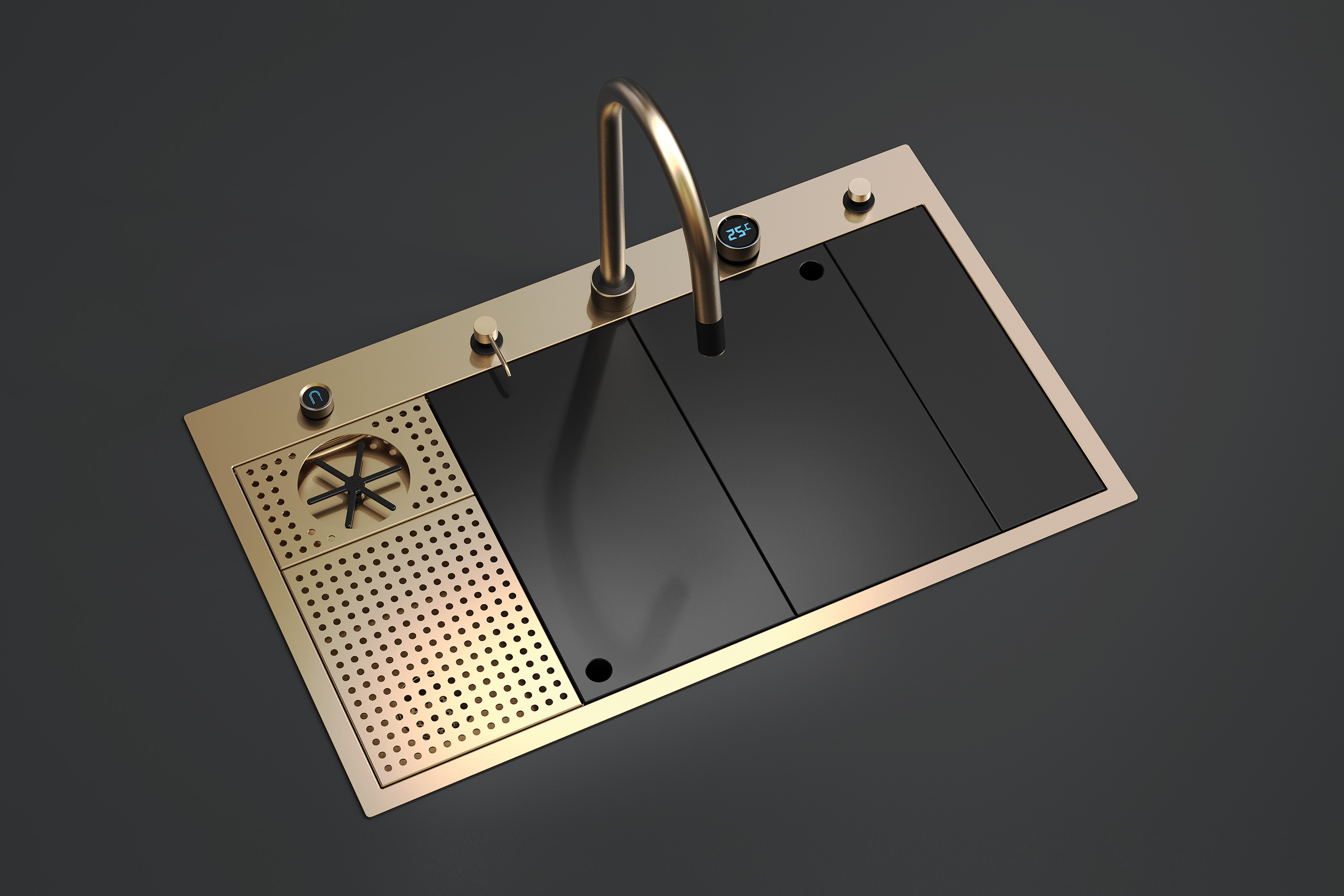 ECOTECH kitchen sink’s advanced features and optimised operations includes a glass rinser, ultrasonic cleaning bowl, and double rainfall jets that efficiently clean while minimising water wastage and removing contaminants. The central area features versatile covers that transform into cutting boards, with smart storage for accessories. A pull-out tap with electronic temperature control and an automatic draining function further enhances convenience. Red Dot Award: Design Concept | Concept | Kitchen Taps and Sinks