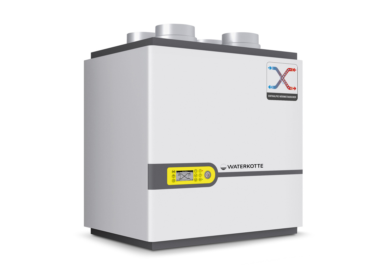 The EcoVent Enthalpie ventilation unit regulates air temperature, air humidity, CO₂ content and air circulation. The integrated enthalpy heat exchanger transfers both heat and humidity from exhaust air into a current of fresh air. The separation of airflow ensures a flawless solution with regard to hygiene. Additional functions are a summer bypass and the fireplace function, enabling the operation of a fireplace in parallel to the ventilation system. The display shows measurement values in real time, with three status LEDs providing additional orientation.