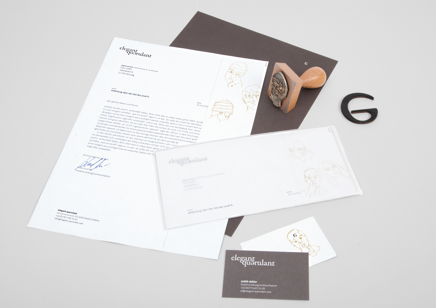 Created for a design collective comprised of eight designers from four different disciplines, this corporate design plays with the contrasts contained in the company name. The “elegant” concept is reflected by the logo’s classical Antiqua font and the clearly structured Grotesque font for the running text. The word “querulant” (German for “troublemaker”) is a synonym for a rebellious, unconventional thinker and is illustrated in the design through an interruption of the elegant typography with the stamped caricatures of the individual designers.