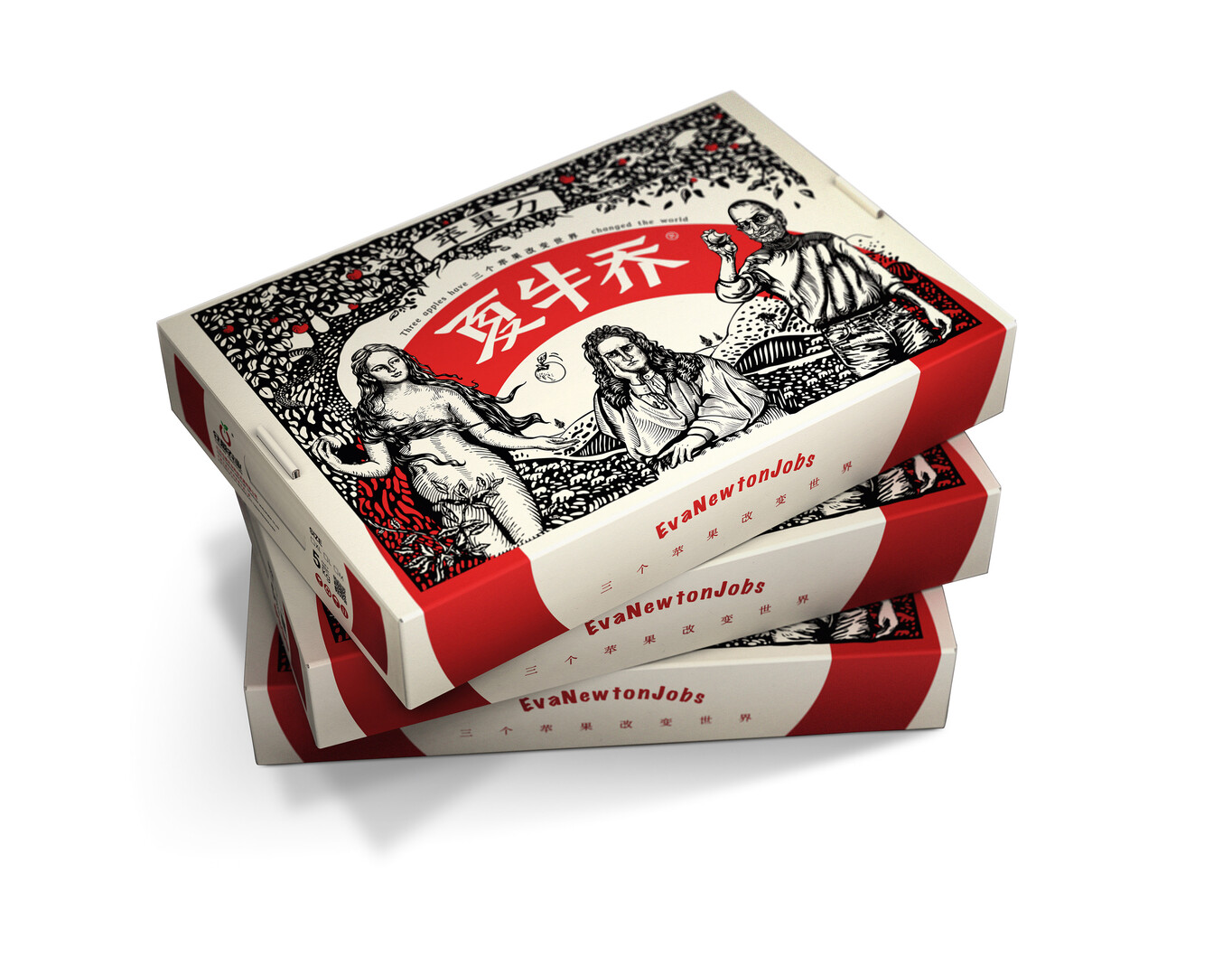 Due to its original illustrations, this packaging design for apples attracts a high degree of attention. With exaggerated and ironic expressions, the illustrations on the package present three famous people linked to the apple. In this way, the design triggers in the audience fast recognition of the brand “EvaNewtonJobs” and amusing associations. As the advertising slogan states: “Three apples have changed the world.” The design aims to make the product memorable for the audience. The Chinese logo is actually a combination of the first Chinese characters in the names of Eva, Newton and Jobs.