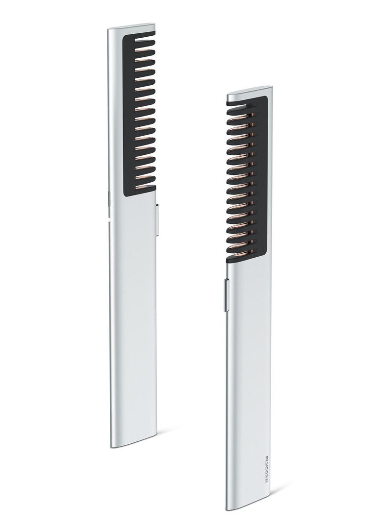 This styling device measures only 6.6 mm in profile and cuts a dash with its striking aluminium-oxide finish and glossy metallic buttons. Its type-C port allows for quick charging of the built-in battery and for cordless operation. Three layers of teeth serve to protect the scalp from burns and result in more effective straightening of hair. Additionally, the ionic function of the comb helps to keep the hair shiny and soft.