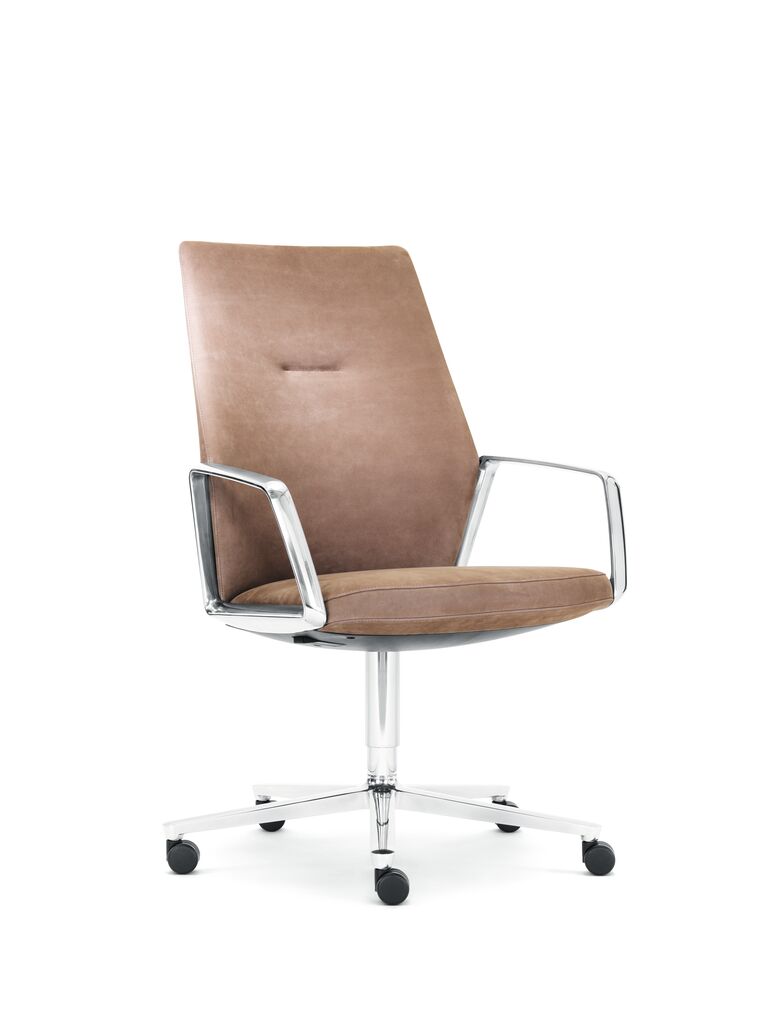 Its elegant appearance of balanced lines and surfaces makes the Eyla a swivel chair the ideal piece of upmarket conference seating furniture. With its many available model variants and ease of use, it is also suitable as a universal swivel chair for the office or the home. The generous upholstery and a concealed tilt mechanism for easy reclining make the chair exceptionally comfortable. The elegant rounded trapezoid-shaped armrest provides, formally and functionally, the connecting element between seat and backrest.