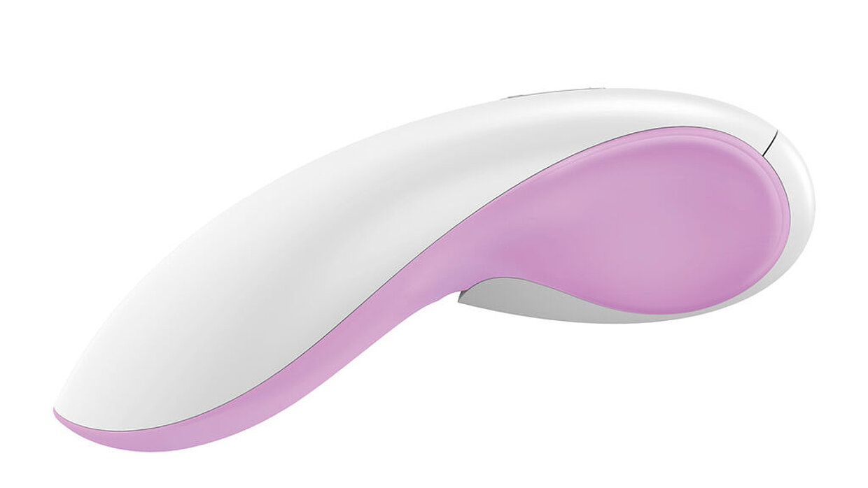 Thanks to its slightly arched form, the F3 nestles perfectly against the female body. Gentle curves, underlined by sensuous colour contrasts, and an easy-to-use control element for regulating the vibration motor make the F3 a particularly intimate accessory. The battery compartment locks securely and unlocks easily with an opener provided with the device.