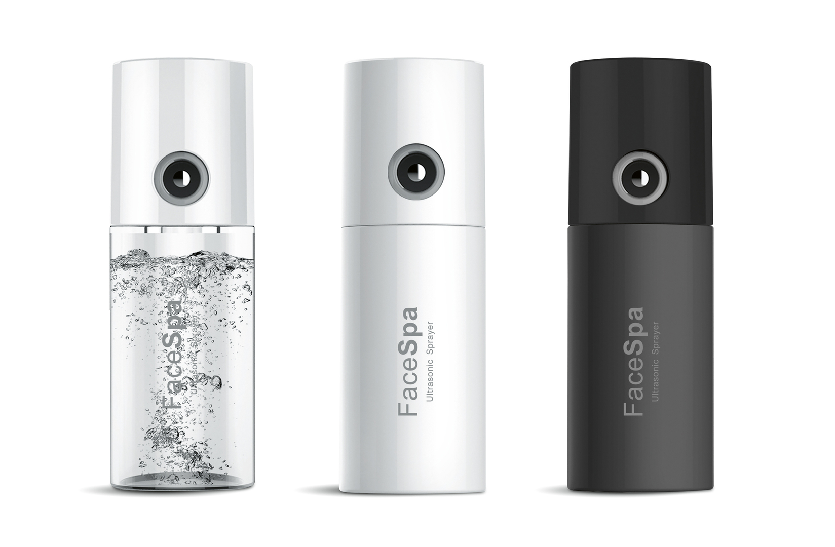 The FaceSpa electric facial steamer is compartmented in two chambers. The smaller upper tank suffices for one to two applications, the larger lower one is used for all-day facial care. After squeezing the cap twice to avoid unintentional release in the handbag, FaceSpa automatically sprays a refreshing water mist in the form of tiny nano-size water particles. The merely ten centimetres large device provides 90 applications when fully charged.
