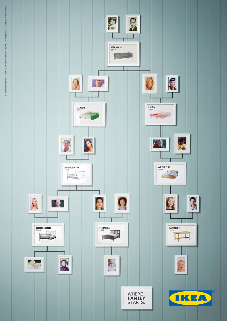 This advertisement is the solution to the challenge of creating a national print and out-of-home campaign that fits the motto of the German IKEA campaign “Time for More Home” with a focus on family. The tagline for this family-tree advertisement reads “Where Family Starts”. It celebrates the estimate that one in ten Europeans was conceived in an IKEA bed. Accordingly, the element common to all motifs is the IKEA bed. In order to visualise the evolution of the product range, the motifs in this “family tree” start with the first bed and continue up to the latest products in the current range.