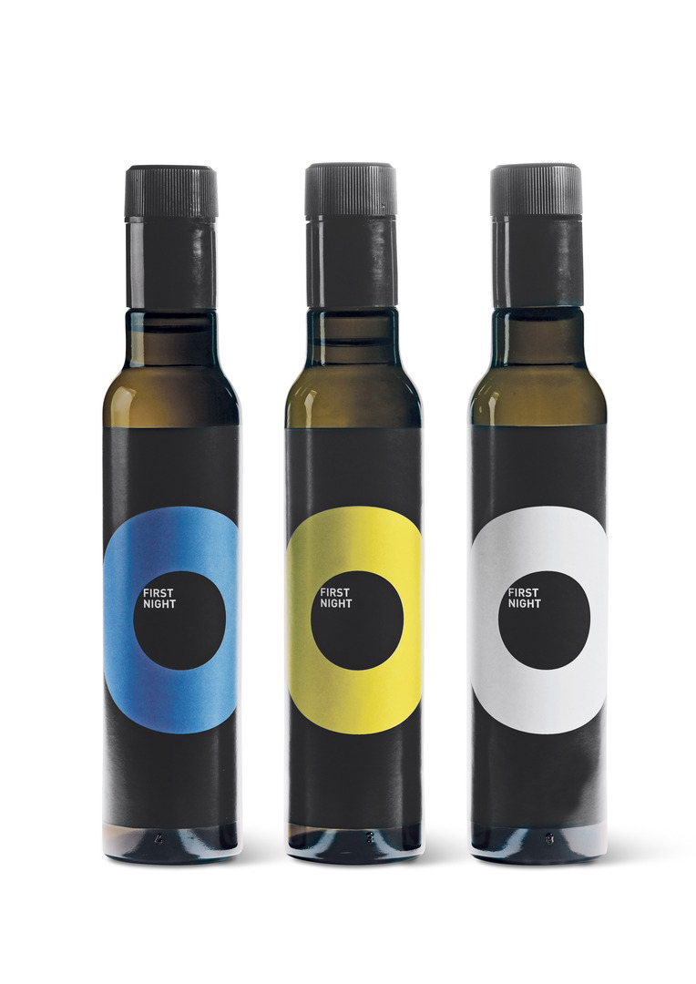 The task of this packaging design was to emphasise the special features of this olive oil. Its manufacturer believes that only olives harvested during the day and processed during the night within 24 hours can produce extra virgin olive oil of the highest quality. The minimalist design of the double circle against the dark background simultaneously symbolises the moon and the cross-section of an olive. In keeping with the label design, a plain, straight, cylinder-shaped bottle was chosen. The key visual represents the night, the time when the oil is produced, while its colour variants provide differentiation between the olive varieties.
