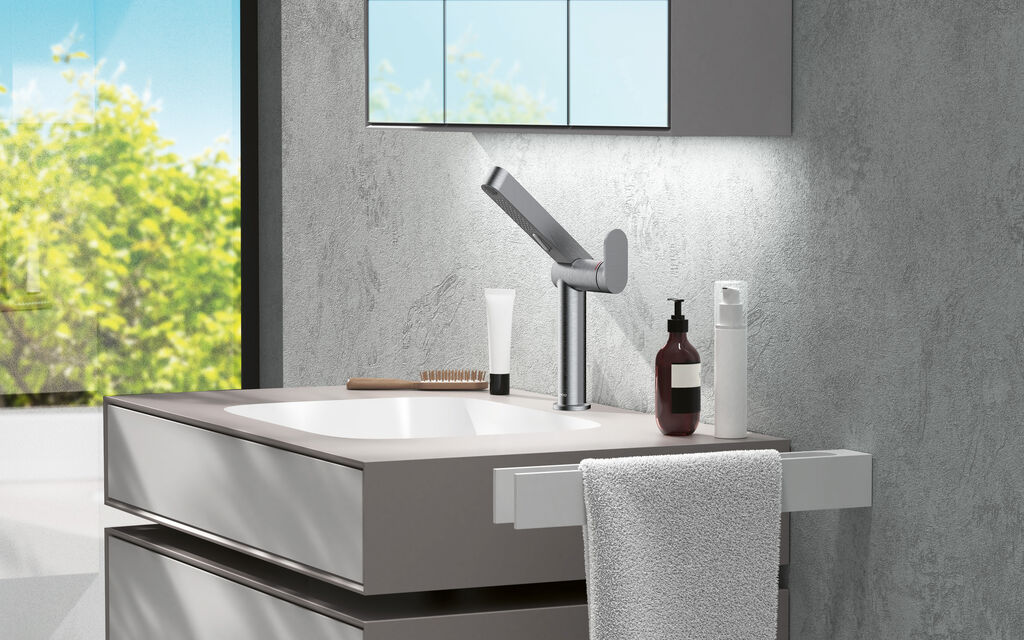 The single- and two-handle faucets in the FLEX Collection are characterised by a long, flat and precisely contoured spout that can be swivelled around its axis, allowing the water jet to be directed exactly where it is needed. Adjusting the angle also changes the outlet height, making it easier for users to perform tasks like hair washing. Two spray options are available: a powerful, targeted water jet and a gentle shower spray. The faucets in the series come in traditional chrome, as well as four different colour finishes.