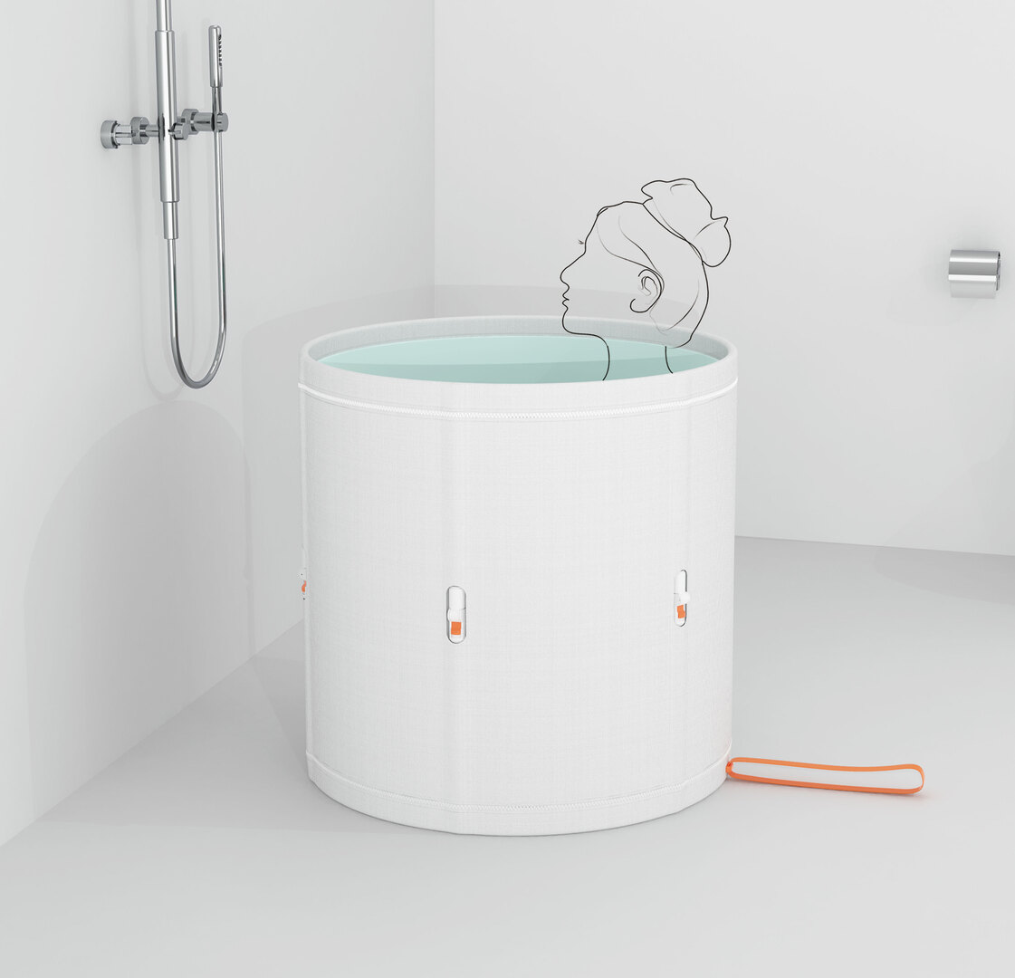 Using a modular design, the main support structure comprises upper and lower glass fibre rings, held up by six metal bars spaced out evenly to form a cylindrical shape. The skin of the bathtub is made with a flexible PVC-laminated cotton cloth that is layered with an insulation material. Folding Bath Tub doesn’t have to be fixed to a space and when expanded, it only takes up 1 square meter of an area.