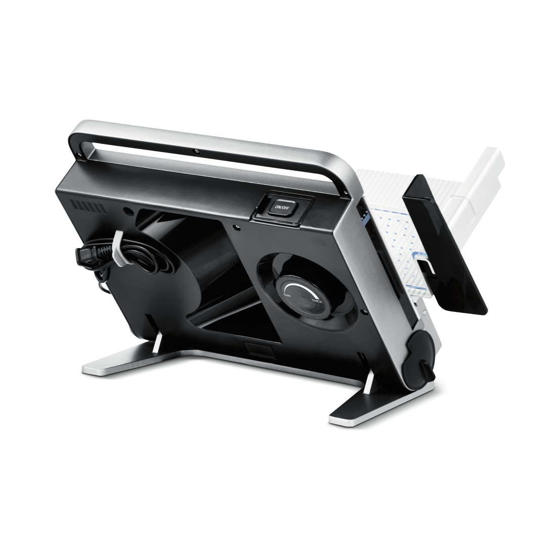 This folding food slicer makes a sophisticated impression; the functional quality is also particularly impressive.