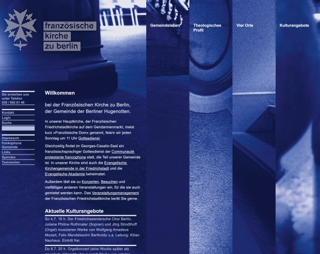 The website for the Französische Kirche (French Church) at the Gendarmenmarkt in Berlin creates a close relationship with the user and, at the same time, provides various sources of information. The concept and the structure meet the challenge to create a contemporary, modern self-portrayal of a church that has already existed since 1672, but its religious life happens in many locations and therefore can’t be connected to only one place. An aesthetically consistent design and a user-friendly navigation centred around a virtual “curtain” accomplish this. The curtain separates theological content and day-to-day schedules in an elegant, sophisticated manner.