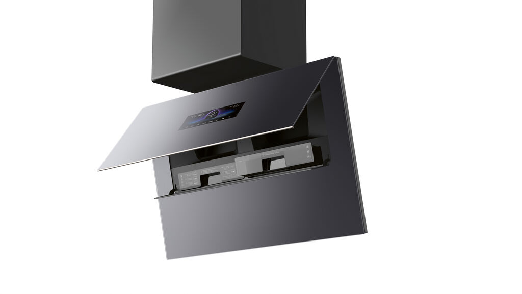 The Fresh-Oxygen Range Hood J6200Z is characterised by its exceptionally flat design. Right angles and flat surfaces in combination with elegant dark grey create a precise geometric design. The seamless anti-glare glass surface and subtle lighting emphasise the minimalist appearance. Integrated oil and water cups make cleaning easier. The device also has a fine dust filter system that improves the quality of the air in the room.