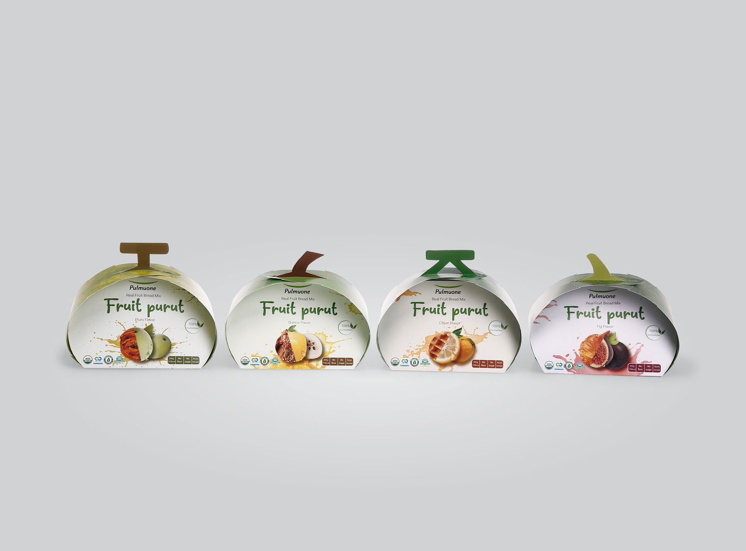 “Fruit purut” is a bread mix which contains fruit as well as grain powder. The convenience product is available with plum, quince, lemon and fig flavour. The packaging design intends to communicate that this food is good for the health. The green lettering of the name is designed to create a fresh impression. In addition, there are illustrations on the front which show the respective type of fruit contained as well as the finished product. The side panels of the oval packaging mimic the appearance of leaves. Opening them reminds the consumer of opening a fruit.