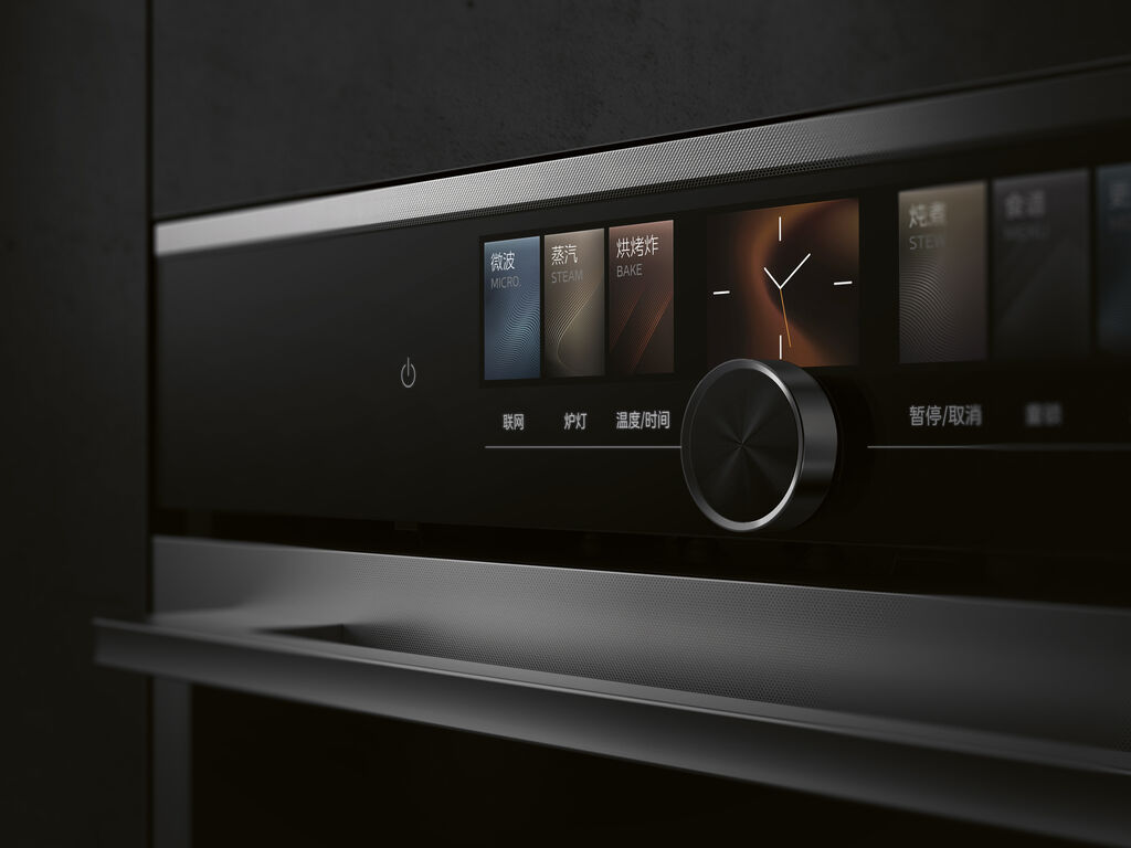 The multifunctional built-in oven GD70 Oven has various microwave, steam, baking and hot air functions that, when used with an app, enable even inexperienced users to prepare a variety of dishes. Its interior volume of 70 litres allows simultaneous baking on three levels. The grey glass door is enclosed by a stainless steel frame including a handle, which, in combination with the large touch display and the elegant control knob, emphasises the clear lines and symmetrical proportions.