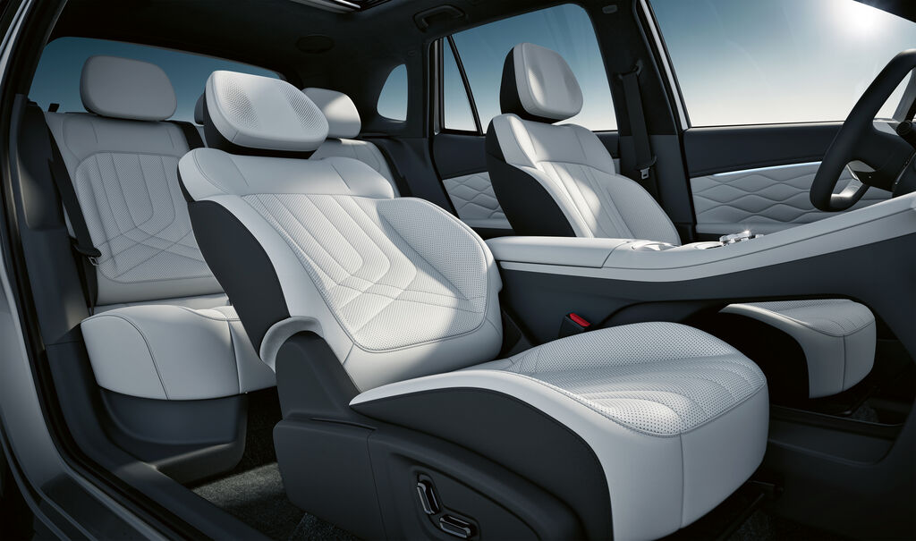 The Geely Galaxy Starship 7 EM-i is a family-oriented, variable plug-in hybrid SUV with a flat body structure and a streamlined silhouette. More than 20 air deflectors reduce the drag coefficient to 0.288. The continuous light lines are based on the aesthetics of spreading waves and emphasise the width. The interior concept allows for 16 seating configurations and incorporates 34 storage compartments. Ergonomically shaped seats with multi-layer padding and a massage function offer comfort even on long journeys.