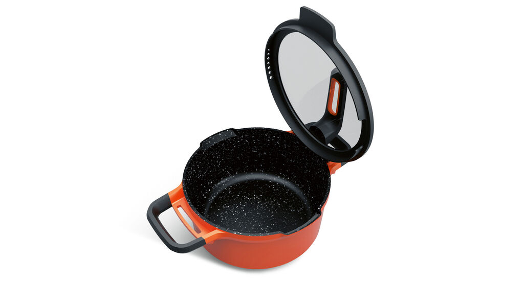 Black Bakelite handles, which stay cool for a long time, form an appealing contrast to the orange body of the pot. Silicone pouring lips ensure drip-free pouring. The tinted glass lid is equipped with a silicone edge, an ergonomic handle and two different sized pouring areas. It can also be positioned vertically on the pot to facilitate stirring and serving, and to prevent condensation drops on the hob or worktop.