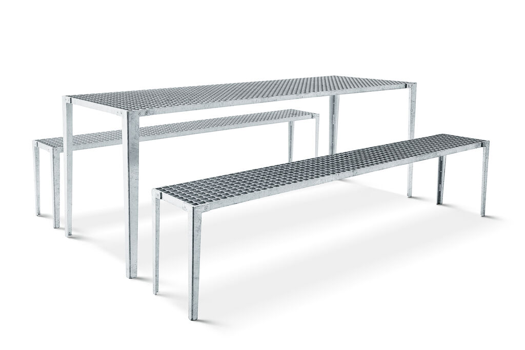 Gravitas comprises robust garden furniture that can be used in both private and public spaces. The conversion of an industrially galvanised steel grid into a table or seat lends this furniture its characteristic look. Available in galvanised or coloured powder-coating, the material ensures long-term weather resistance. Two table models as well as various stools, benches and seat covers made of wool felt complement the product series.