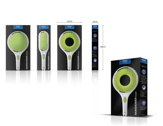 The GROHE Rainshower Icon com­bines showering with economical water usage and resource-sustaining production. Consequently, the packaging design is included in this ecological approach and communicates both aesthetics and the product’s value with eye-catching visual language and emotionally appealing typography. Compared to the previous product generation, the packaging volume has been reduced by almost 50 per cent, significantly reducing its carbon footprint. Consumers in non-traditional sales channels also represent the target group of the Eco-Chic packaging design.