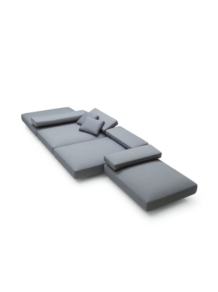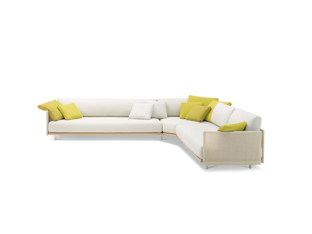 Harbour is an outdoor seating system made up of various elements that are characterised by their comfort, elegance and carefully thought-through detailing. The stainless-steel structural frame is partially encased with wood to give it a natural touch. The back and armrests are covered with Maris, a recyclable, durable fabric developed by the manufacturer, which is resilient and impervious to water. With sustainability in mind, the soft and inviting cushions are largely filled with fibres made from recycled, single-use plastic.