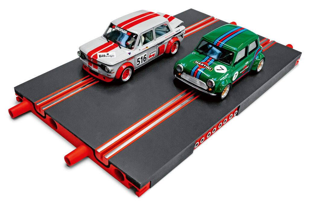 Harrel is a model car race track that can be used with all known slot cars to a scale of 1:32 and 1:24. Commercially available power supply units can be connected for control. The module is a complex assembly based on a high-quality wood composite. The surface is asphalt grey lacquer with quartz sand for the right grip. The connection segments and plastic components consist of high-performance polyamide and are screwed together as a module. A thick copper line connects the connections and supplies the visible conductors with electricity. The different modules can be easily plugged together to form an individual track of up to eight tracks next to each other.