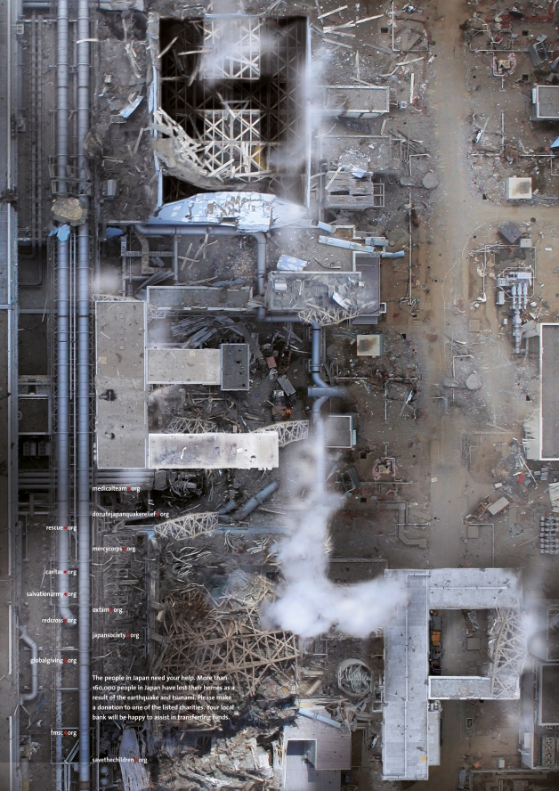 The designers, whose motto is “winning over people”, felt it was their obligation to help people and designed an appeal for dona-tions in the form of a poster, which they provided to charitable organisations for free, and in this way they could support the Japanese population after the earthquake and the tsunami. The design, inspired by the world-wide recognisable images of drones, utilises a top view of the destroyed nuclear plant and modifies the topographic layout of the plant as well as the steam to create the letters “HELP” for the appeal.