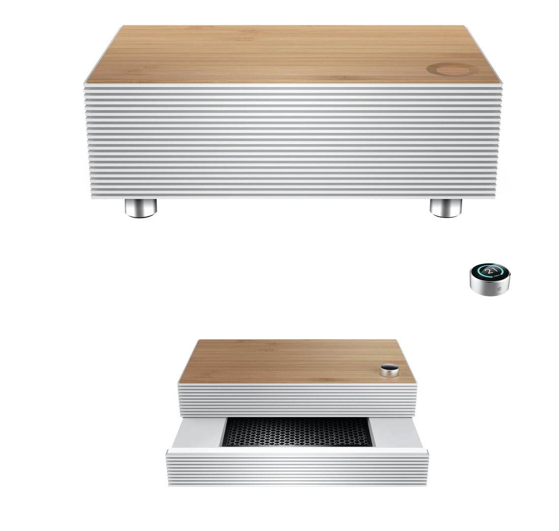 The particular feature of this intelligent tabletop air purifier is its wood-textured surface, thanks to which the Hemnes can be perfectly integrated into residential environments. An innovative attribute is the drawer filter with a unique way of opening. The unit is monitored with a small remote control simultaneously serving as an air-testing device. As soon as it detects poor quality, the purifier starts automatically.