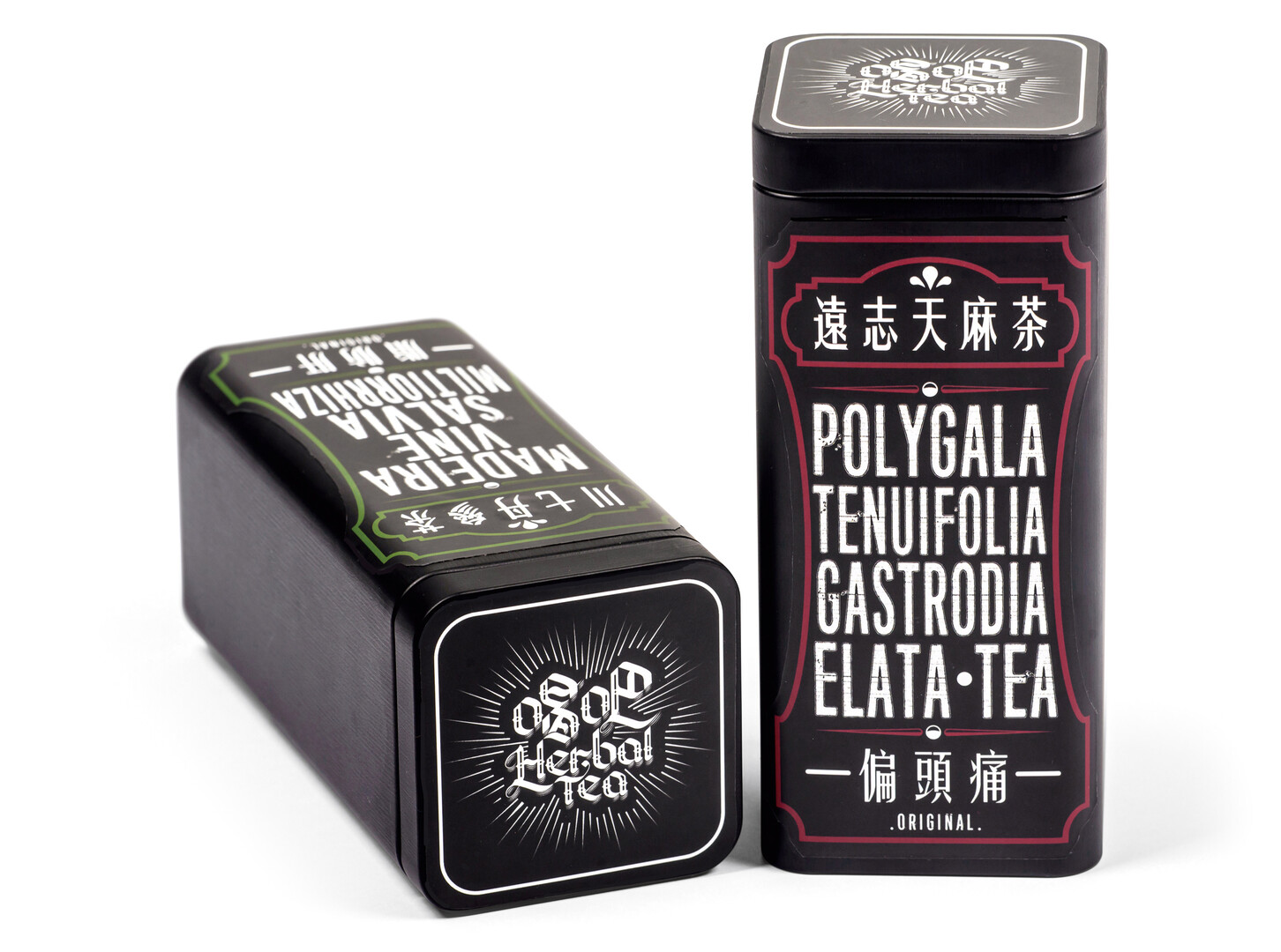 These teas, which are based on natural herbs and ingredients, are provided in nine varieties. Their packaging has a largely western appearance. They intentionally break away from the traditional look of Chinese medicinal herbs. The herbs are filled into glass bottles, the filigree illustrated labels of which indicate, in word and image, for which organ of the body the respective sort is suitable. Not only the labels, but also the slim, black tea boxes with white print are decorated with various spot colours, a different one for each kind of tea.