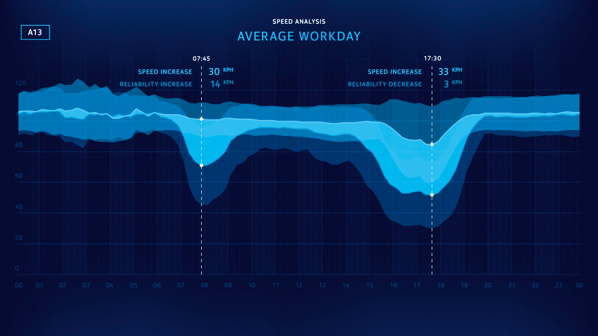Launched by the technology company HERE, “Traffic Analytics” is a suite of data products that enables both enterprises and governments to access traffic analyses and reporting from multiple countries. This walk-through animation was created to demonstrate the suite’s functionality at non-staffed events, enabling people to explore the possibilities of the product on their own. Through data-driven animations, using 2D- and 3D-motion software, visualisations and scenarios were created that allow users to analyse commuter patterns in a particular city, to quantify travel demands or to create trend reports.