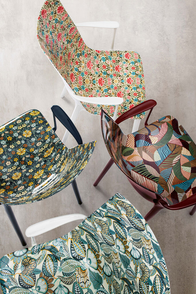 The H.H.H. collection allows for attractive combinations both indoors and outdoors. The floral design of the Kartell x Liberty edition is particularly striking.