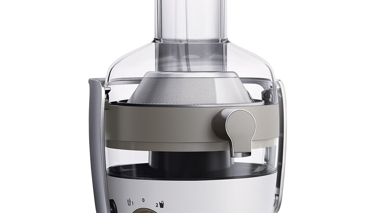 Its distinctive silhouette and an architectural form language confer on this blender a powerful impression. A sturdy, metal rotary knob for speed control is located prominently and offers three preset programs. A light ring around the knob indicates the different running speeds. When blending, Problend 6 3D blending technology is actuated, where the cutting tool sits on a coloured spacer, thus assuring that the contents are evenly blended.