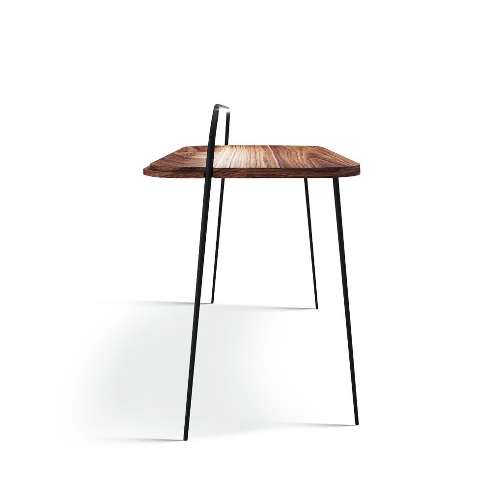 Highlight combines the functionality of a desk and a lamp in a single piece of furniture. It consists of a solid walnut tabletop with cone-shaped metal legs. These are angled and tapered to create a slim and elegant silhouette. The lighting spot is integrated within a metal rail and is turned on and off by lifting and lowering the rail. The LED lamp is suitable for reading, but also for casting an atmospheric light on the ceiling or wall.