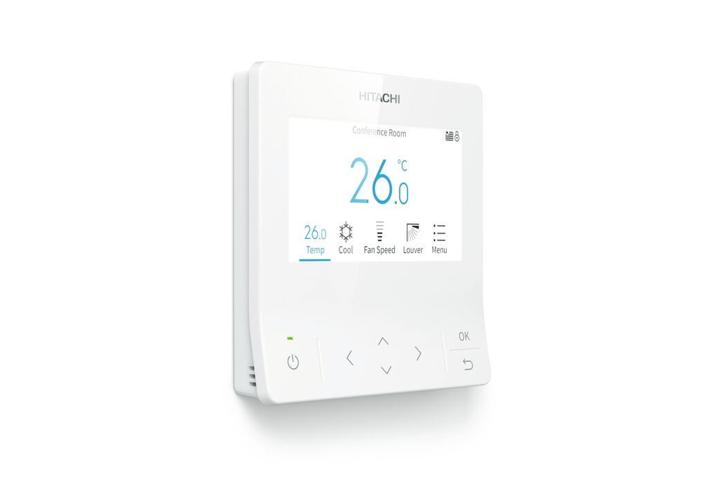 Hitachi Advanced Color is a controller designed for the wall installation of air-conditioning systems on residential and commercial premises. It has a self-explanatory display that clearly shows the relevant information. The function keys are located on the slightly angled lower edge, allowing the hand to assume a natural position when typing. With its fresh, reduced aesthetics, the remote control blends well into interiors of many different styles.