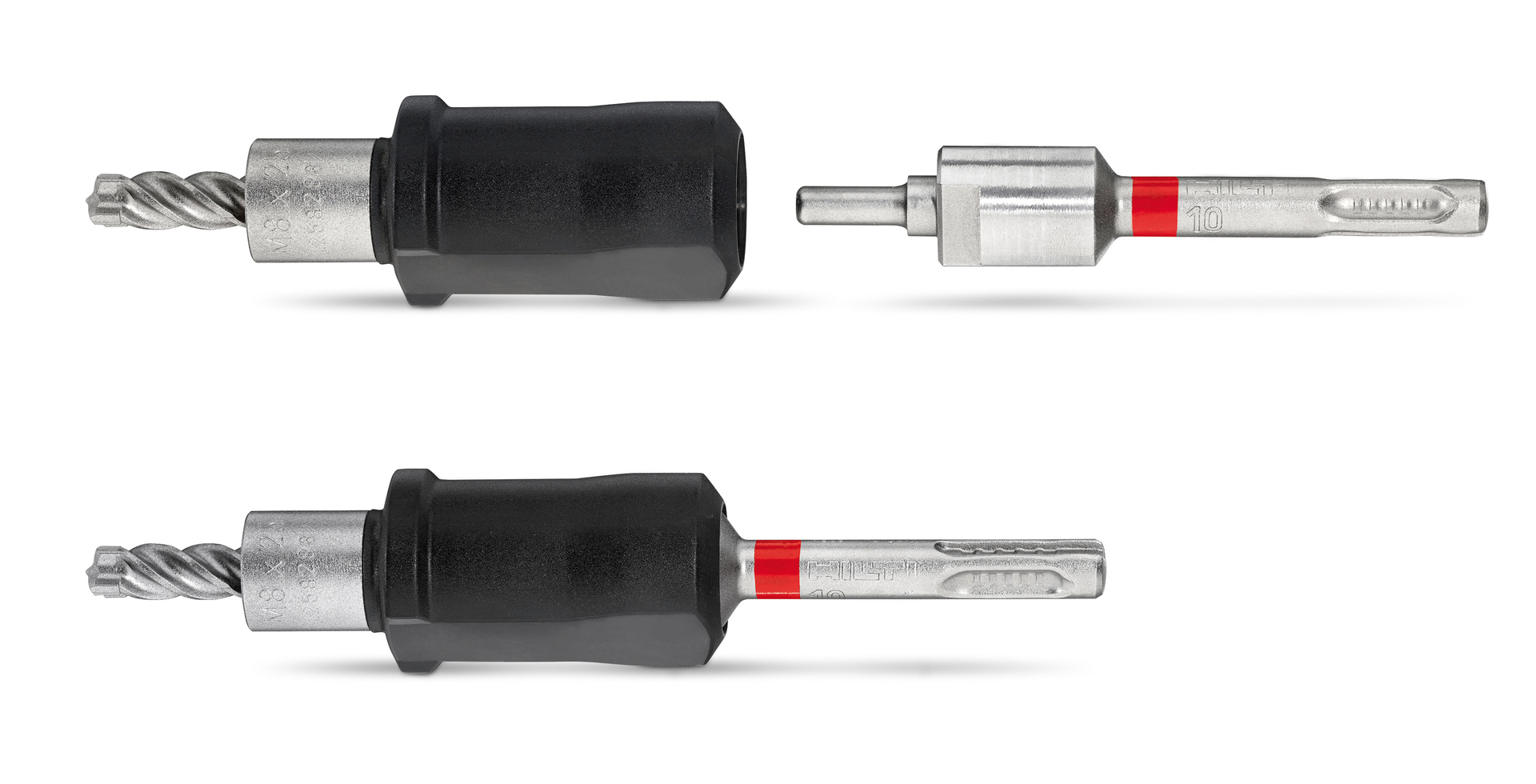 The HKD-TE-CX setting tool makes it possible to complete two tasks with only one tool: drilling a hole and setting the anchor. Since it is no longer necessary to release the chuck to change tools, the entire installation can be carried out almost twice as quickly as before. The setting tool is simply inserted into the chuck of a rotary hammer. After drilling is completed, the front section of the tool is pulled off and the anchor is set in the wall using the setting section of the tool. The drilled holes always have the correct depth.