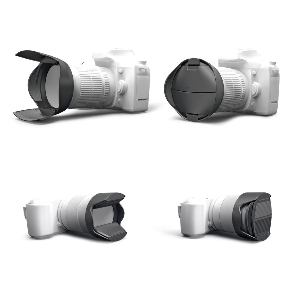 Hoocap is a combination of lens hood and cap. Placed on the lens of a camera, the cap protects against dust, scratches and fingerprints. When the two wings are folded open, the cap turns into a lens hood, shielding against stray light and preventing lens flares on the images. Hoocap is available in customised versions for different lenses.