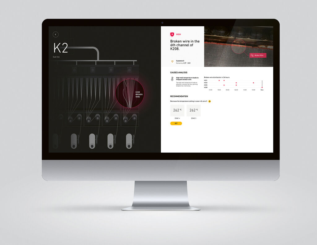 Huawei Industrial Internet (Spinning) is an artificial intelligence system enabling the processes of a Smart Spinning Factory by assisting in its production and operation. Using IoT and AI in spinning manufacturing, the machines, data and humans are interconnected, allowing the factory to rapidly respond to changing needs. Featuring a clearly structured layout, the system realises the visualisation for individual machines, the production line, workspaces and the whole factory. Based on IoT, AI and immersive user interfaces, the system can monitor various equipment and process parameters in real time.