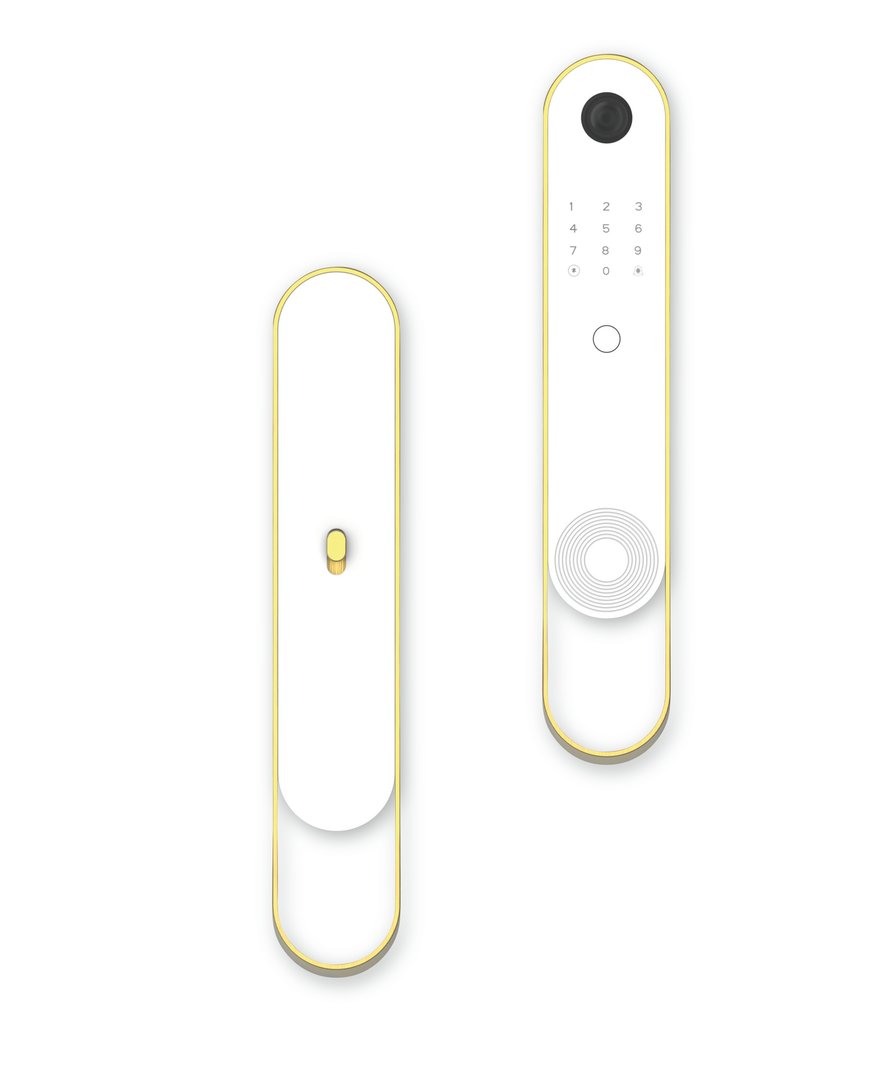 The Hutton smart lock is characterised by exquisite ring elements with a rounded, elegant geometric shape and an integrated handle at a tilt angle of 15 degrees that is easy to close. The reduced design projects a simple visual aesthetic with a colour mix of white and brushed gold. The lock is intuitive and easy to use and, apart from an alarm, its range of functions includes no less than seven unlock modes such as face recognition, fingerprint or app remote authorisation.